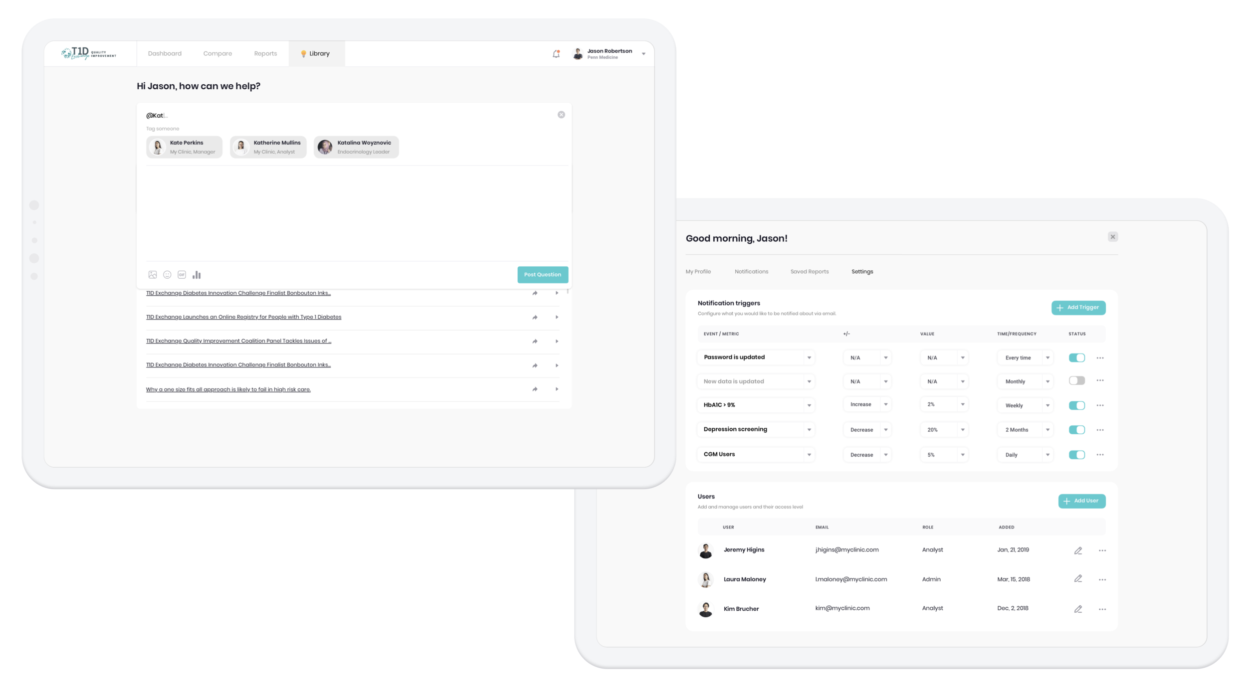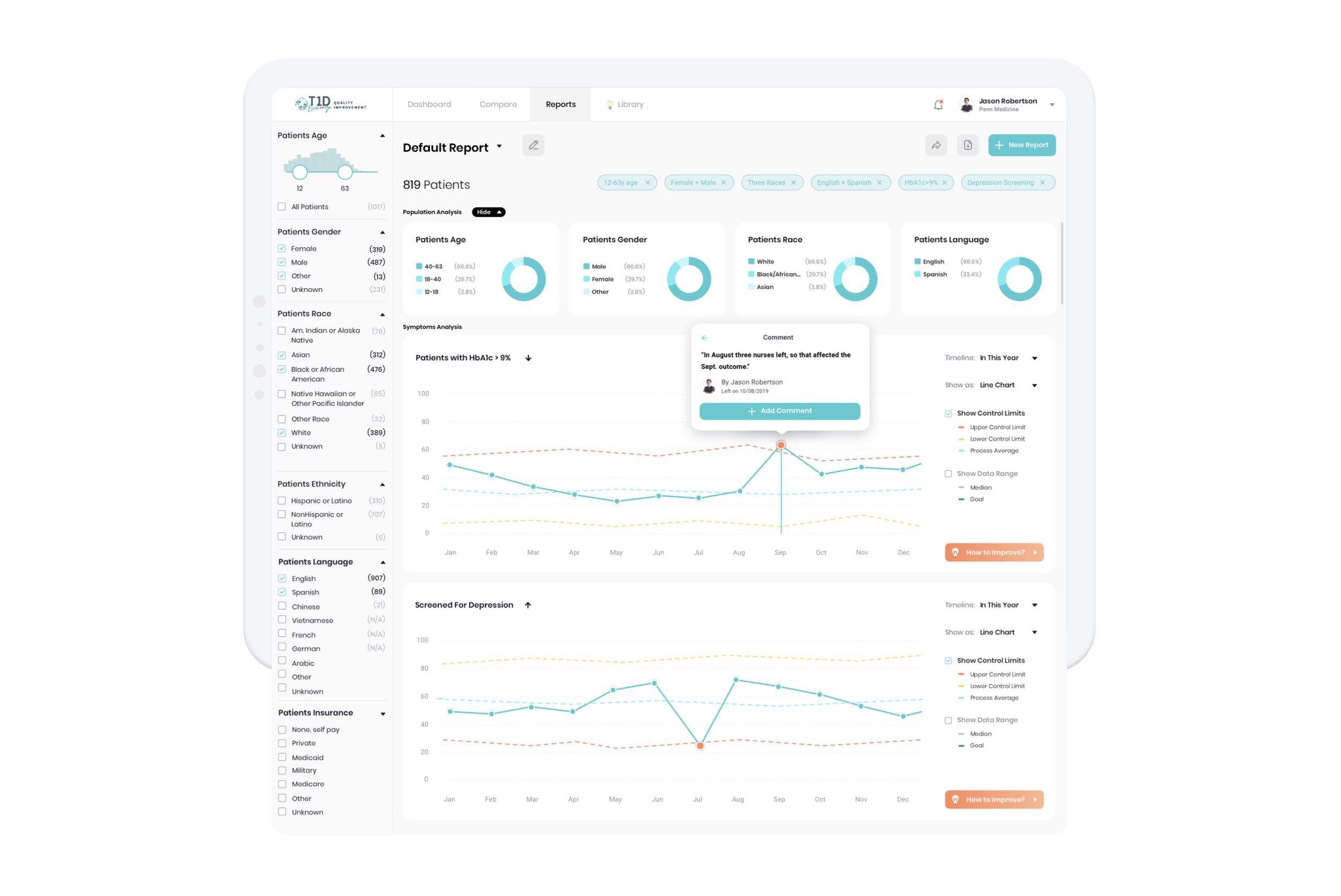 We conducted primary research, design sessions and created high fidelity prototypes to create a web platform for a community of diabetes clinicians, administrators, parent advisory committees and data governance. The outcome was a deep but easily navigated site for clinics across the United States to share data and best practices to raise the level of care for T1D patients. One significant feature is enabling each clinic to filter and sort multivariate data to see trends and compare care practices with other clinics.