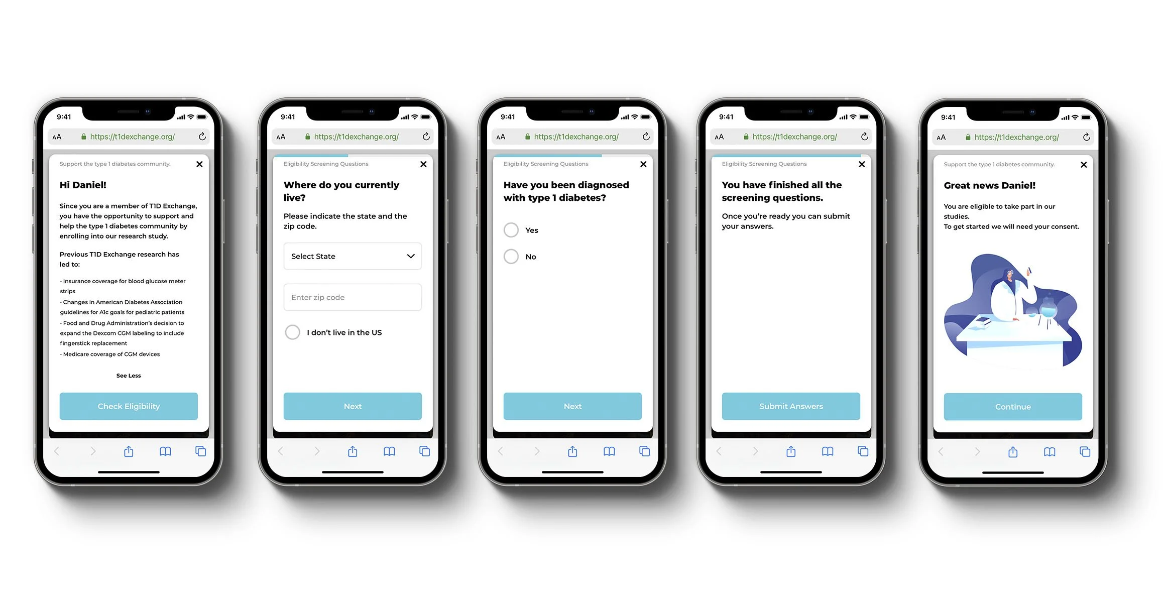 T1D Exchange manages a clinical trial that collects longitudinal data from patients. We worked with T1D’s development team to design the web onboarding flow and took care to adhere to the strict privacy and trial requirements which resulted in a simple, consistent experience for new and existing trial participants.