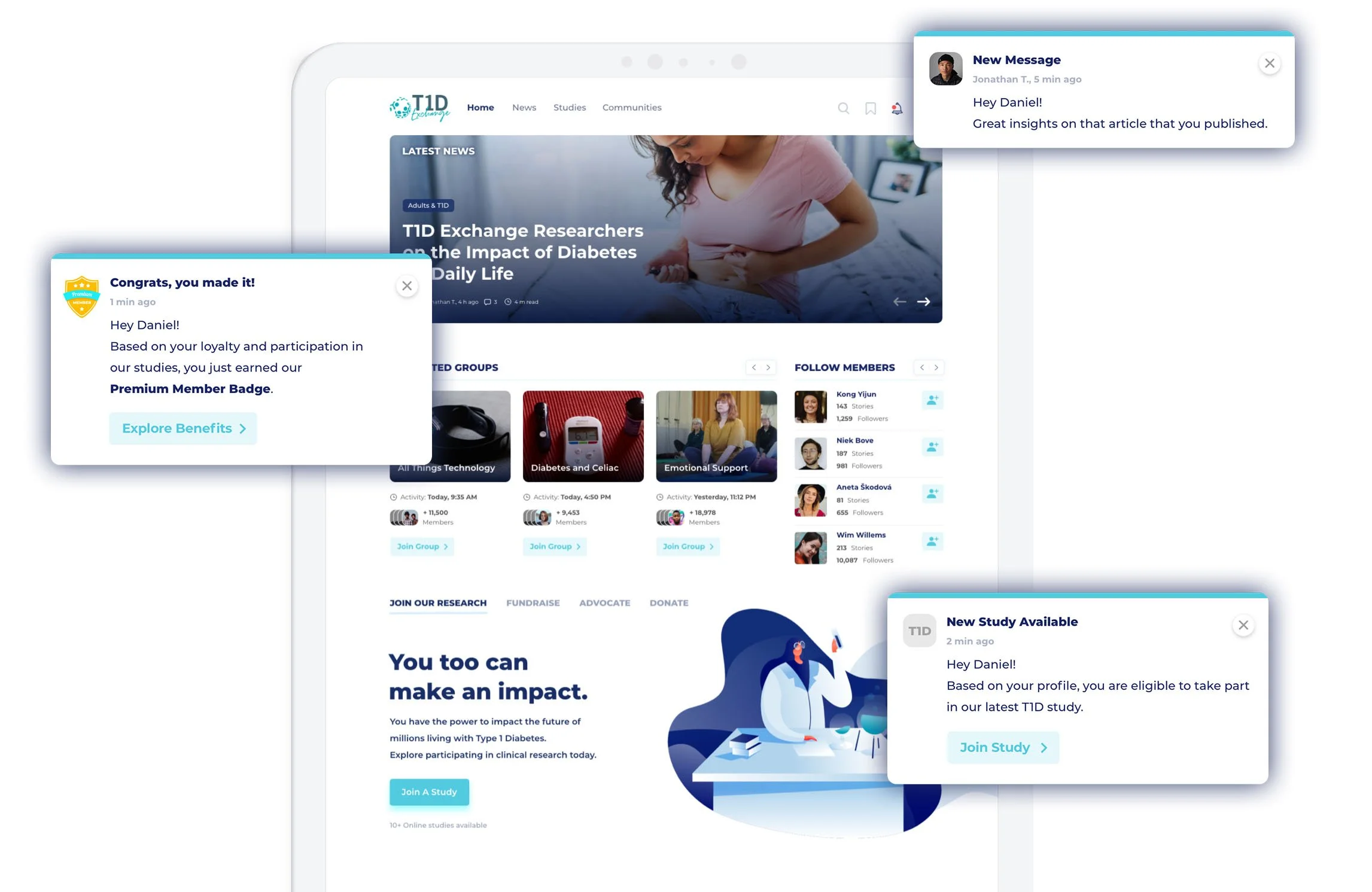 We have worked with T1D Exchange as its design and development partner for several years creating web experiences to serve a variety of T1D themed functions.